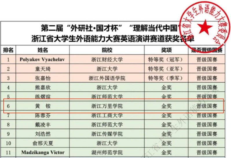 11月4日,“外研社·国才杯”“理解当代中国”全国大学生外语能力大赛浙江省赛圆满落幕,我校学子荣获1金、4银、2铜的成绩。英语系的黄铵和日语系的郭煜成功晋级演讲赛道国赛。