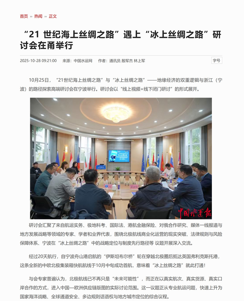 《中国水运网》“21 世纪海上丝绸之路”遇上“冰上丝绸之路”研讨会在甬举行