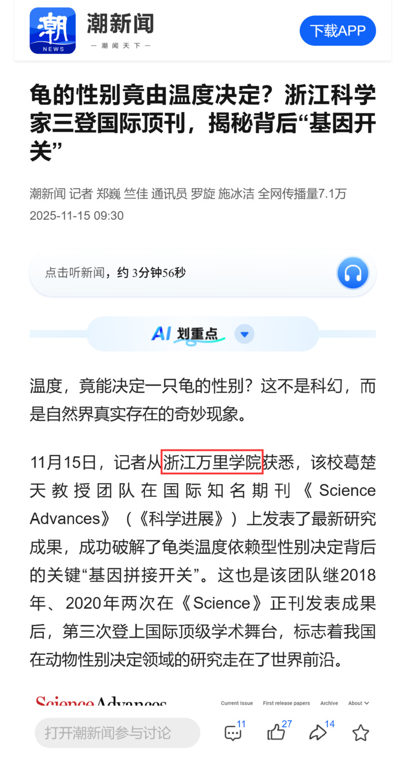 《潮新闻》龟的性别竟由温度决定?浙江科学家三登国际顶刊,揭秘背后“基因开关”
