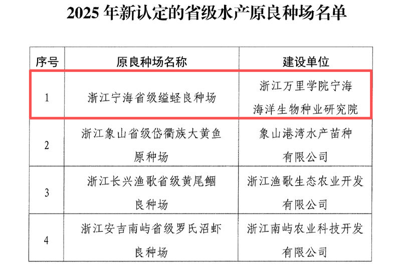 近日,浙江省农业农村厅、浙江省海洋经济发展厅联合发文,正式公布了新晋的一批省级水产原良种场名单,浙江万里学院宁海海洋生物种业研究院承担建设的“浙江宁海省级缢蛏良种场”成功入选。这标志着研究院在海洋贝类种质资源保存、优良品种研发及种苗标准规模化扩繁全方面迈入了全省领先行列。
