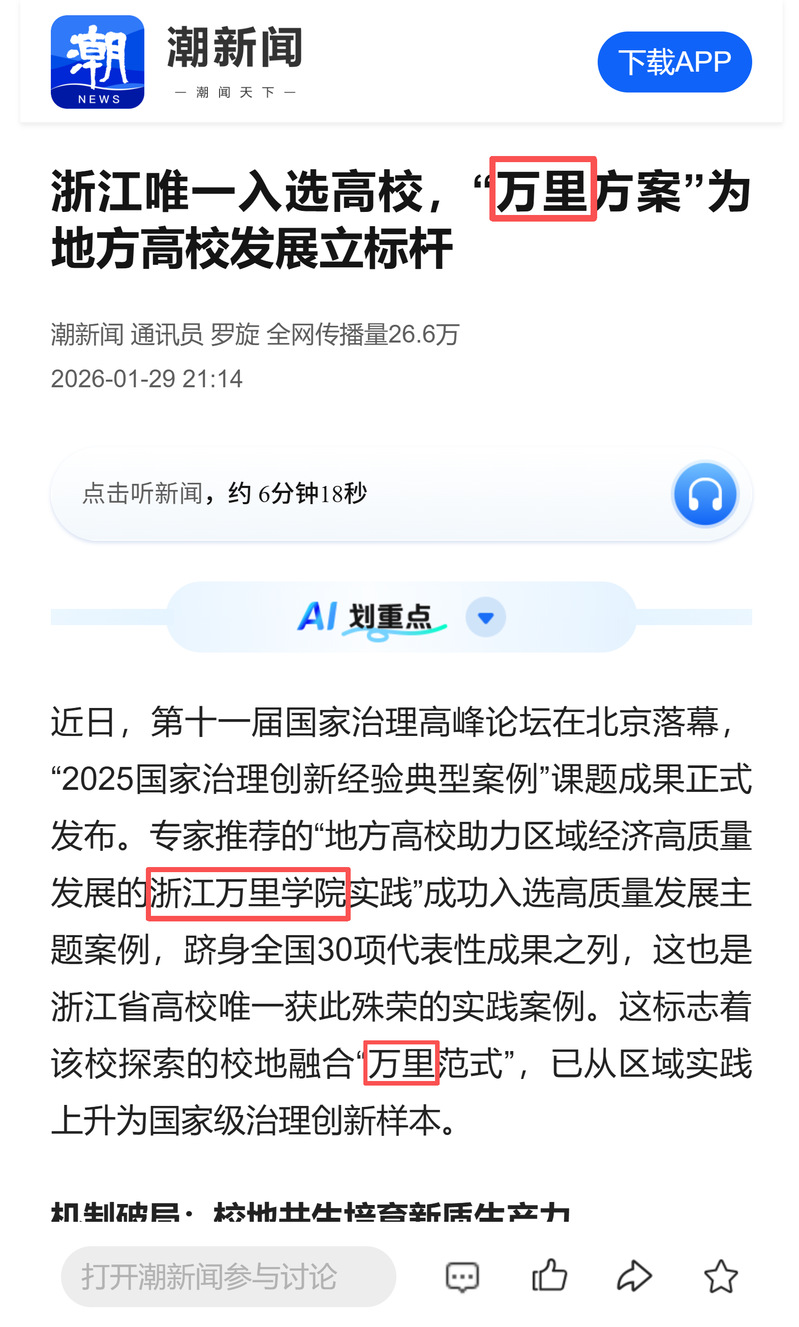 《潮新闻》浙江唯一入选高校,“万里方案”为地方高校发展立标杆