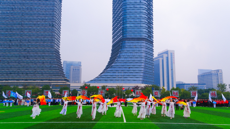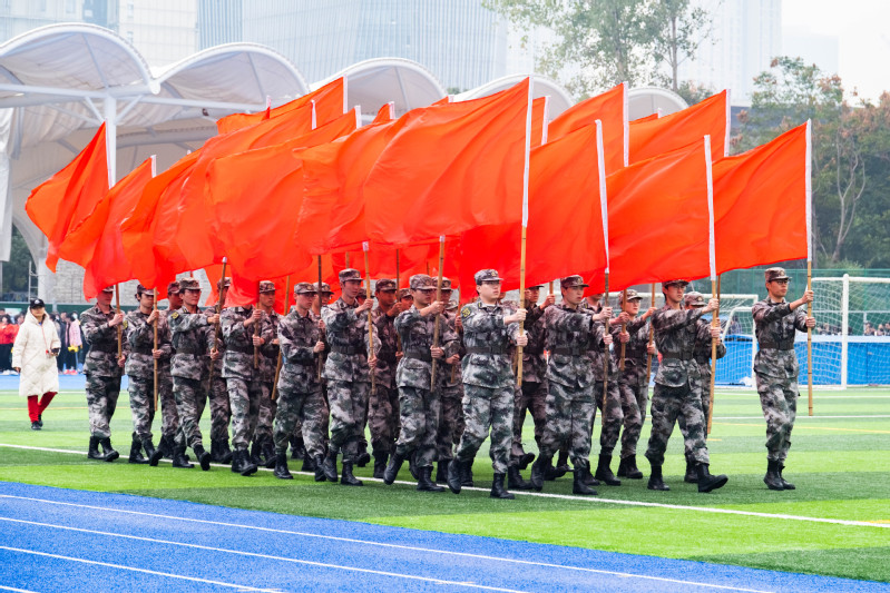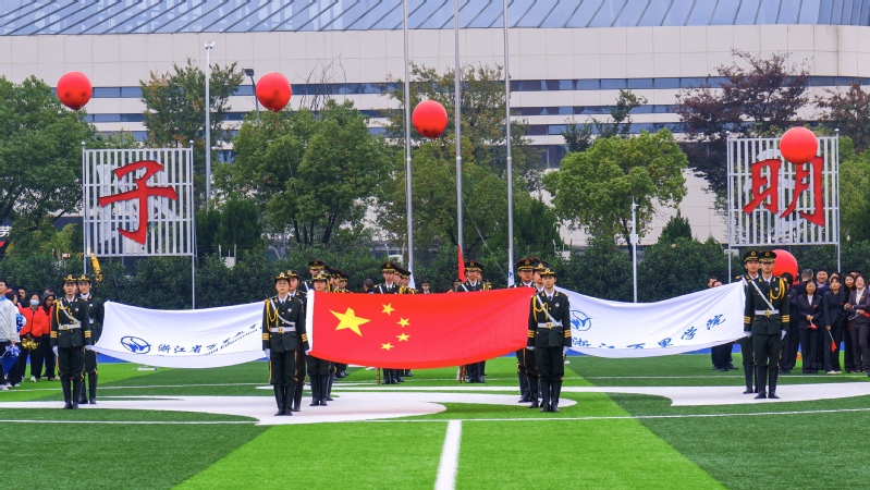健身操舞俱乐部、舞龙俱乐部精彩的开场表演拉开了运动会的序幕。伴随着铿锵有力的《运动员进行曲》,各二级学院、教工代表、裁判员、志愿者组成的方队依次入场展演。他们步伐稳健、列队整齐、精神饱满,彰显了万里师生昂扬的精神风貌。方阵入场后,升国旗奏国歌,全场肃立,庄严合唱。